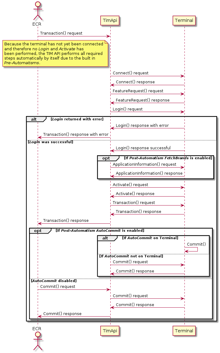 • Pre-Automatisms: This means that all actions that need to be done before a function can be called. E.g. a transaction can be called in disconnected state without having called connect, login and activate in advance. These are called automatically by the TIM API before the transaction is performed. The Pre-Automatisms are enabled by default.