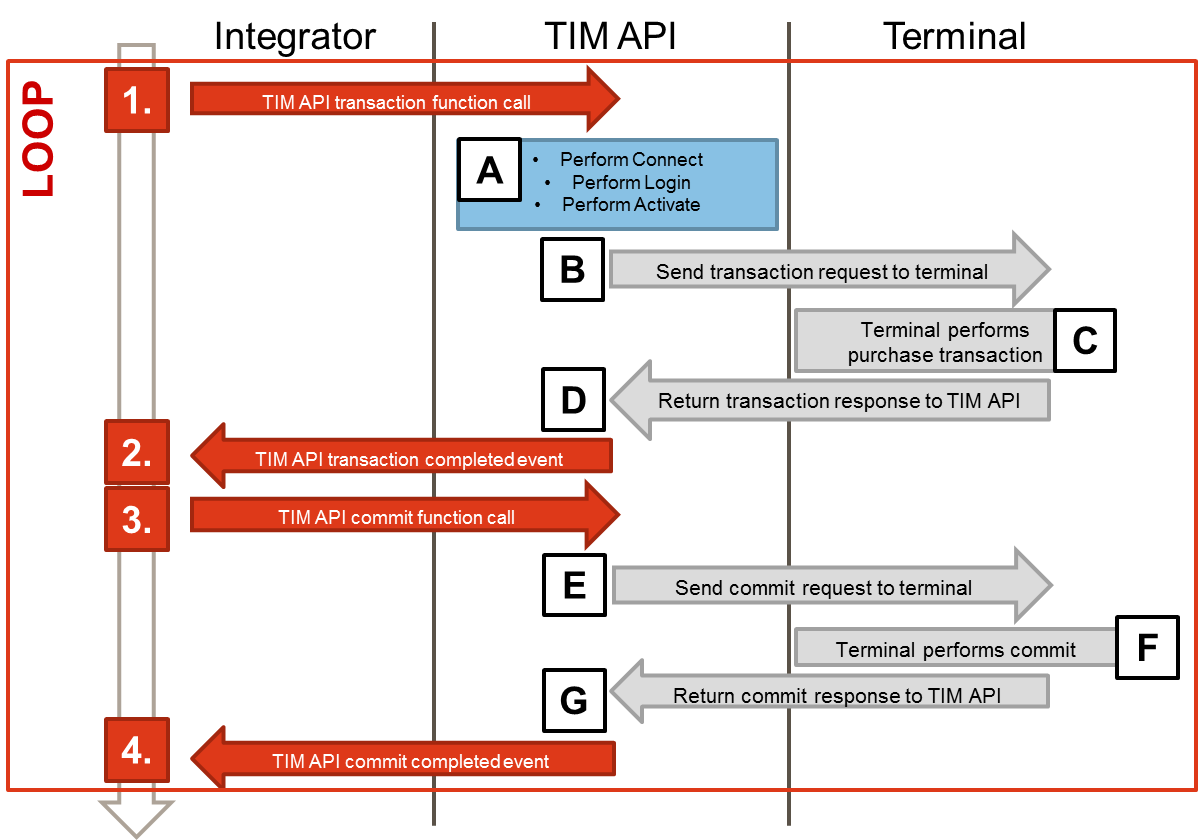 The flow on the right shows a simple transaction flow and which steps are done by which participant. Note that for a simple use the integrator only needs to follow 4 simple steps, steps 1 to 4. Steps 1-4 can be performed multiple times (loop) if wished. The rest, steps A to G, will be done either by the TIM API itself or by the terminal if required.